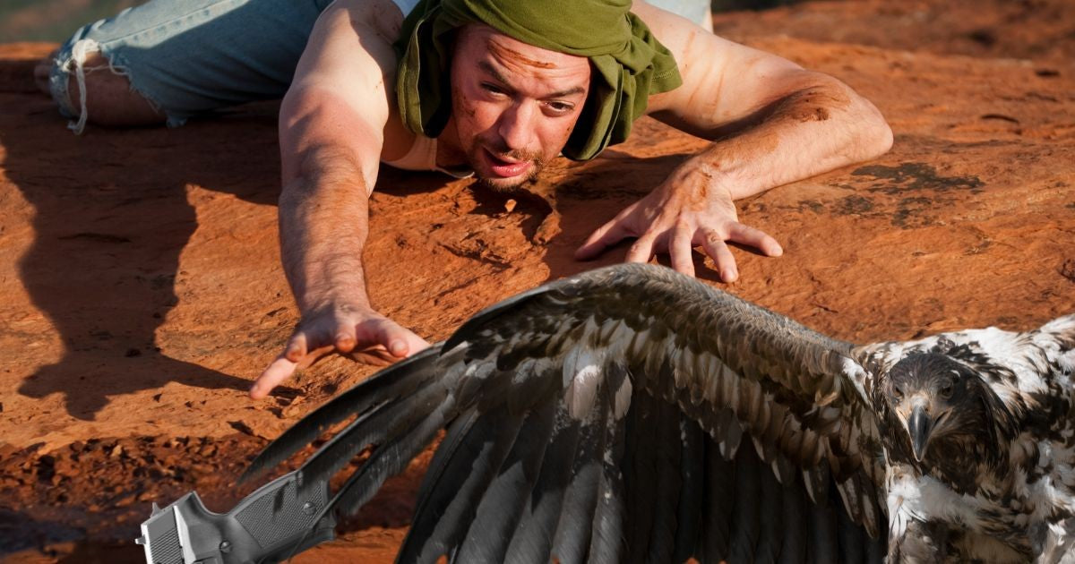 The hiss of a rattlesnake spooks the horse and strands another man in the desert, in the heat, sun, and sand.