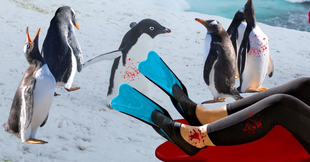 Red splattered the white snow as the penguins ripped the fleshy creature with their beaks, pulling the muscle and sinew from the bones. This particular creature had not been scaled, but rather covered in a strange, black, rubbery second skin. It had fought at first, but the blood loss caught it quickly.