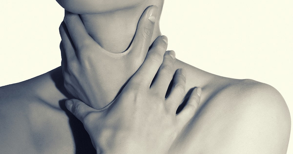 She clutches desperately at her throat and gags loudly—a deep, hoarse sound erupts from her lungs as she struggles to breathe. She throws her head over the toilet basin, but nothing comes out.